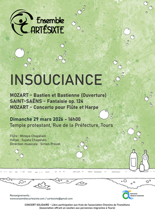Renseignements : www.ensemblecartesixte.com / cartesixte@gmail.com CONCERT SOLIDAIRE – Libre participation aux frais de l’association chemins de Transitions (Association offrant un soutien aux personnes migrantes à Tours)